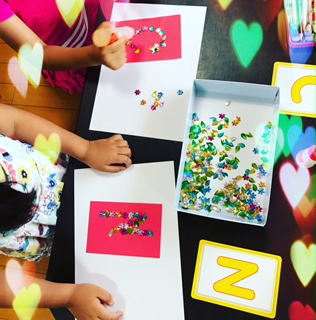 今日は発話練習の合間に、女の子に大人気のスパンコールを使って、名前の頭文字アルファベットカード作り。